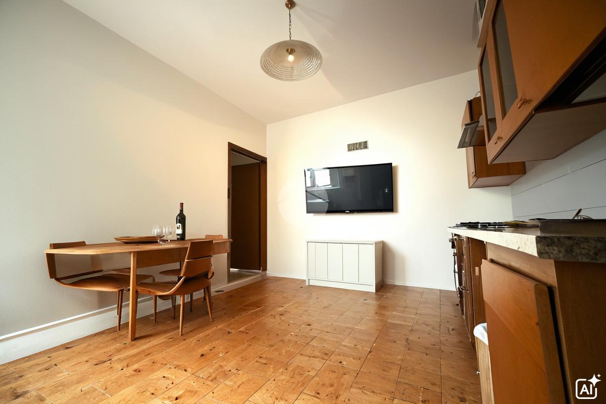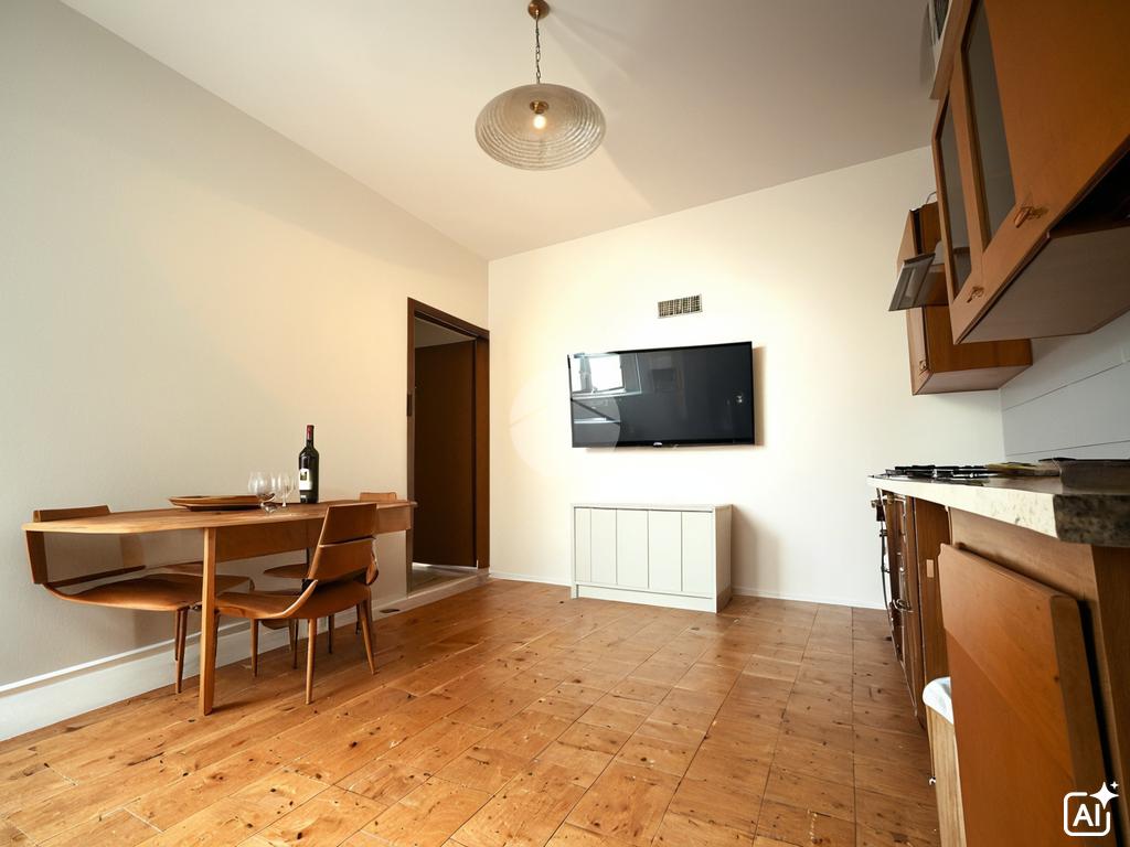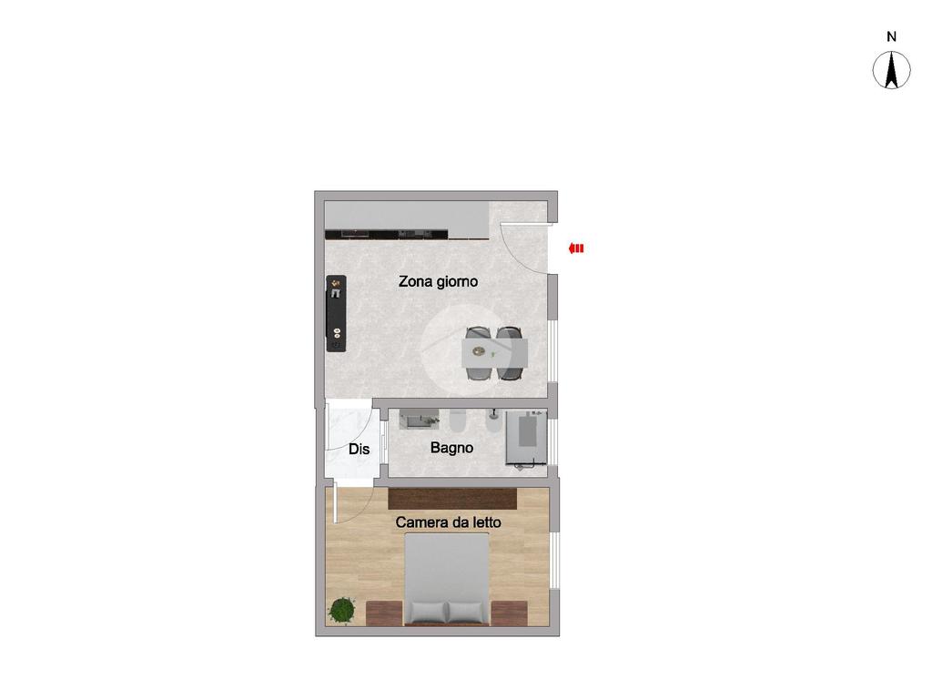 L’appartamento bilocale è composto dalla luminosa zona giorno open space costituita da: angolo cottura, zona pranzo arredabile con set di tavolo e sedie.